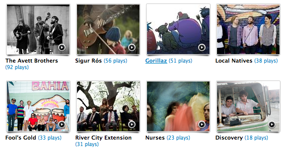 It’s been just under 4 months since I started this Music Monday thing, and I wanted to talk about what’s been topping the charts in that past time. And because next week will introduce the new format of Music Monday, I wanted to give you a culmination of the past time. So above is all the accompanying pieces of art from past entries combined to make one big piece. Last.fm offers me a chart for the past 3 months, so that’s what I give to you.